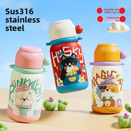 Cartoon Children's Double Drinking 316 Stainless Steel Insulated Cup Student Straw Cup Portable Strap