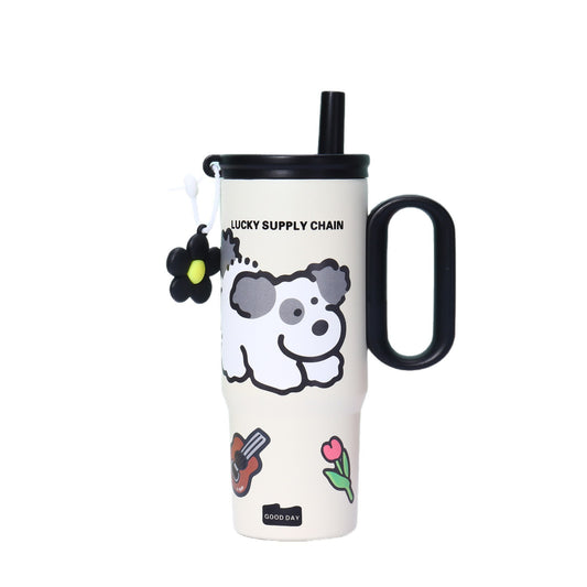Puppy Pattern 316 Stainless Steel Large Capacity Insulated Cup with Handle and Straw